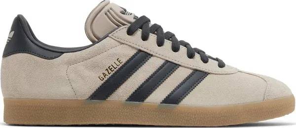 The 'Wonder Taupe Night Indigo' Gazelle, style code IG6199, showcases a premium suede upper, complemented by leather accents on the iconic Three Stripes and heel collar. Its design incorporates a T-shaped toe overlay, a padded tongue with Adidas branding, and the signature gold foil "GAZELLE" lettering. A gum rubber outsole ensures reliable traction and adds to the shoe's aesthetic appeal.