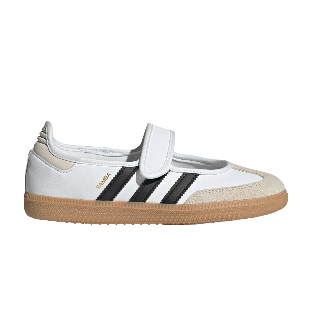 This iteration features a low-profile silhouette, a Mary Jane-inspired design, and a round toe. The upper is crafted from smooth leather, complemented by a suede T-toe overlay, and a synthetic lining, adding to the shoe's refined aesthetic. A grippy gum rubber outsole ensures durability and traction, while the iconic serrated 3-Stripes and goldfoil 'Samba' branding maintain brand recognition.