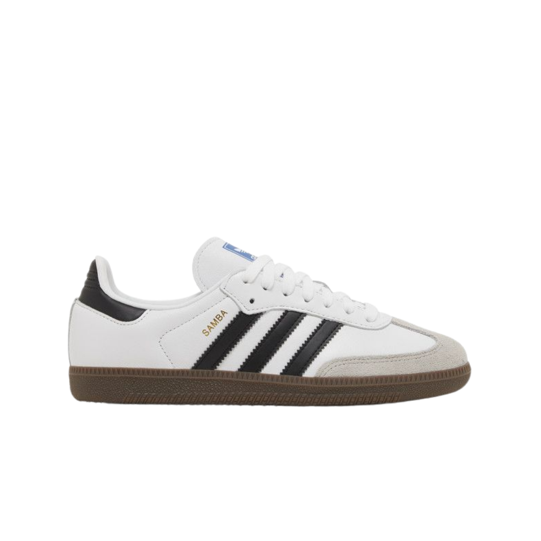 The Wmns Samba OG 'White Clear Granite' showcases a low-profile silhouette, meticulously crafted with a full-grain leather upper, elegantly contrasted by a grey suede forefoot overlay. The design incorporates a signature T-toe, complemented by black leather detailing on the heel tab and iconic three-stripes. A vibrant blue Adidas tongue tag provides a distinct visual element.