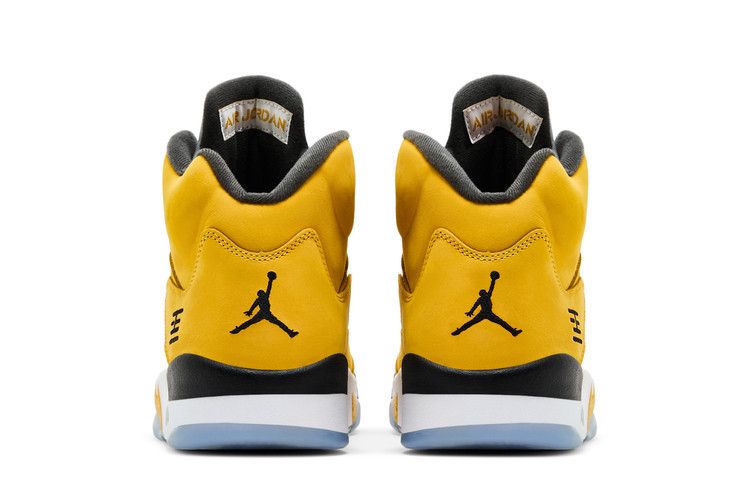 The Air Jordan 5 Retro T23 'Tokyo' 2025 is meticulously crafted with a vibrant yellow nubuck and suede upper, creating a striking visual contrast. Translucent quarter panel netting and grey molded eyelets provide structural support, while a silver reflective tongue and textile collar lining enhance the aesthetic. The shoe incorporates Nike Air technology, visible in the heel and encapsulated in the forefoot, with a black and white foam midsole featuring a distinctive yellow speckled sharktooth design. A grey liner and yellow toe cap complete the construction.