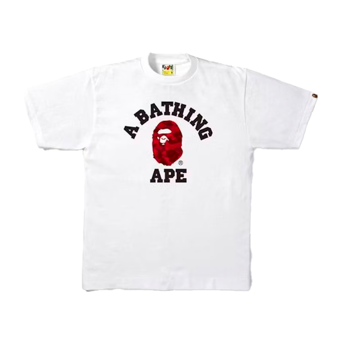 Crafted from 100% cotton, the tee features a crew neckline and a straight hem, ensuring a relaxed fit. The design includes the Ape Head emblem and a rubber-printed COLLEGE logo in a COLOR CAMO pattern, showcasing the brand's signature motifs. Further details include printed graphics and an Aba Ape tag on the left sleeve, solidifying its place in the BAPE canon.