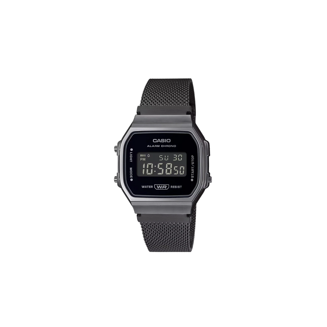The A168WEMB-1BDF showcases a robust construction, featuring a resin case with a black chrome plating, ensuring durability and a sleek aesthetic. The watch is protected by a resilient resin glass crystal, providing clarity and safeguarding against wear and tear. Furthermore, the inclusion of a stainless steel mesh band, finished with black ion plating, offers both comfort and a refined visual appeal, securing its position as a timeless accessory with a modern twist.