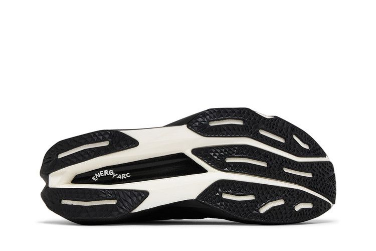 The FuelCell SuperComp Elite v4 'Black' is meticulously engineered for optimal performance, featuring an engineered mesh base enhanced with FantomFit technology for a secure fit. Premium materials, including PEBA foam for superior cushioning, suede accents on the mudguard, heel, toe, and eyestays, and a robust solid rubber outsole, contribute to the shoe's durability and responsiveness. The inclusion of the Energy Arc carbon fiber plate geometry, with strategic midsole voids, further enhances propulsion and energy return for the wearer. The design is a testament to the seamless integration of form and function.
