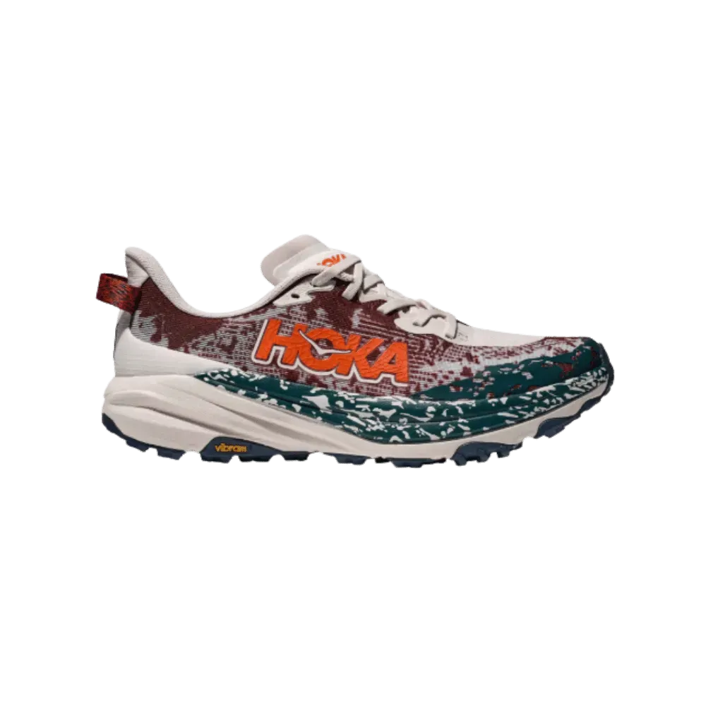 The Speedgoat 6 is meticulously crafted with a lightweight woven textile upper, enhanced by an internal support chassis designed for optimal breathability and secure foot lockdown. The midsole utilizes ultralight Compression-Molded EVA (CMEVA) foam, providing a responsive ride with a high stack height, ensuring both cushioning and stability. The outsole features Vibram Megagrip rubber with Traction Lugs, optimized with micro-serrations, delivering superior grip across various trail conditions, a testament to its durable construction.