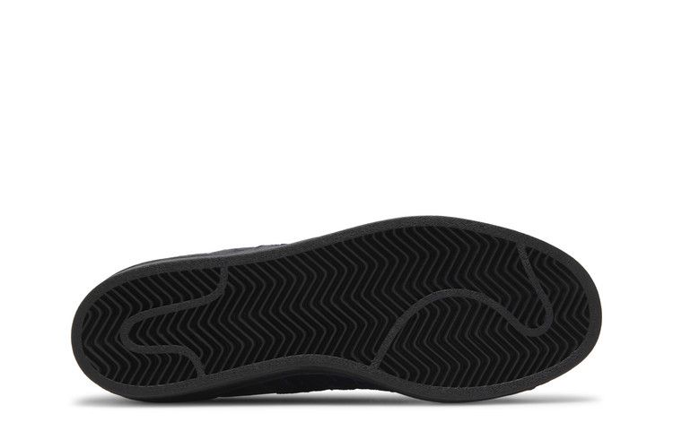 The 'Black Dark Purple' colorway showcases a mid-top silhouette, anchored by the classic reinforced shell toe, a hallmark of the Pro Model series. The upper is crafted from hairy core black suede, complemented by a distressed overlay that reveals a purple hue with wear. Additional elements include leather detailing, a textile lining, and a breathable cloth tongue. The design incorporates gold foil accents and Kader's name in gold on the side.