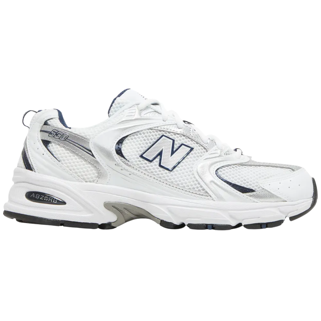 This iteration of the New Balance 530 features a white mesh upper, complemented by metallic silver and white synthetic and leather overlays. The design emphasizes breathability, key for comfort during wear. The midsole integrates ABZORB cushioning in the heel alongside an ENCAP midsole, providing both support and impact absorption. A durable rubber outsole ensures reliable traction, solidifying its performance-oriented design.