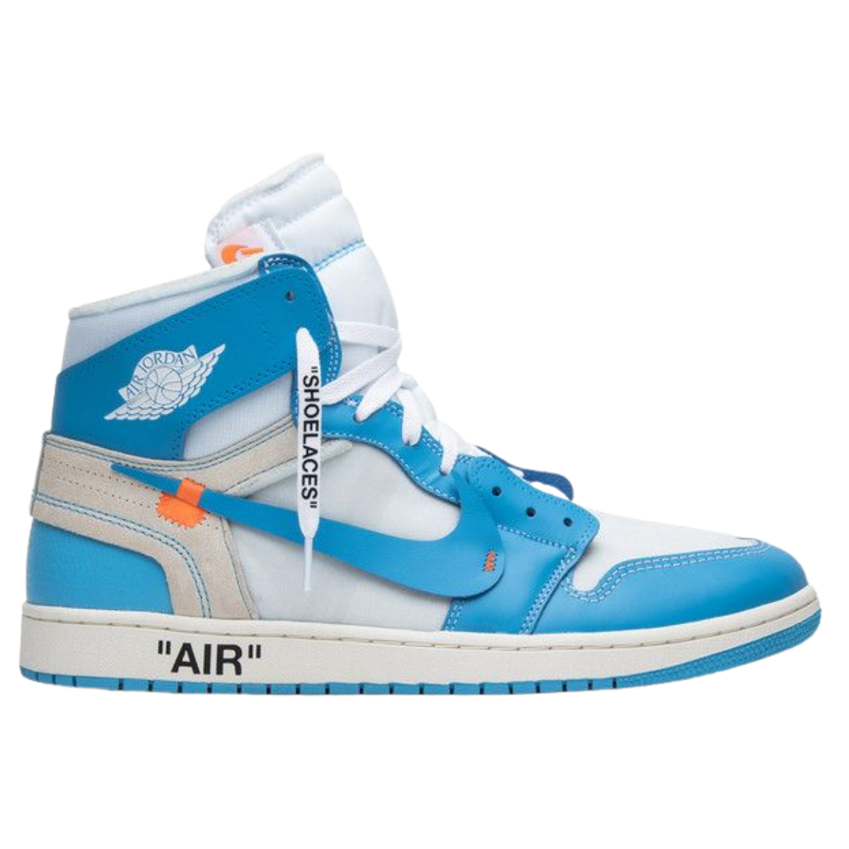 Primarily designed for casual wear, the Air Jordan 1 Retro High OG Off-White UNC offers a blend of style and comfort. Its construction includes Nike Air technology, providing cushioning under the heel, enhancing the overall wearability. The pyramid-shaped traction pattern on the powder blue outsole ensures grip and stability, making it suitable for everyday use, while its premium materials and design elevate it beyond the realm of mere athletic footwear.