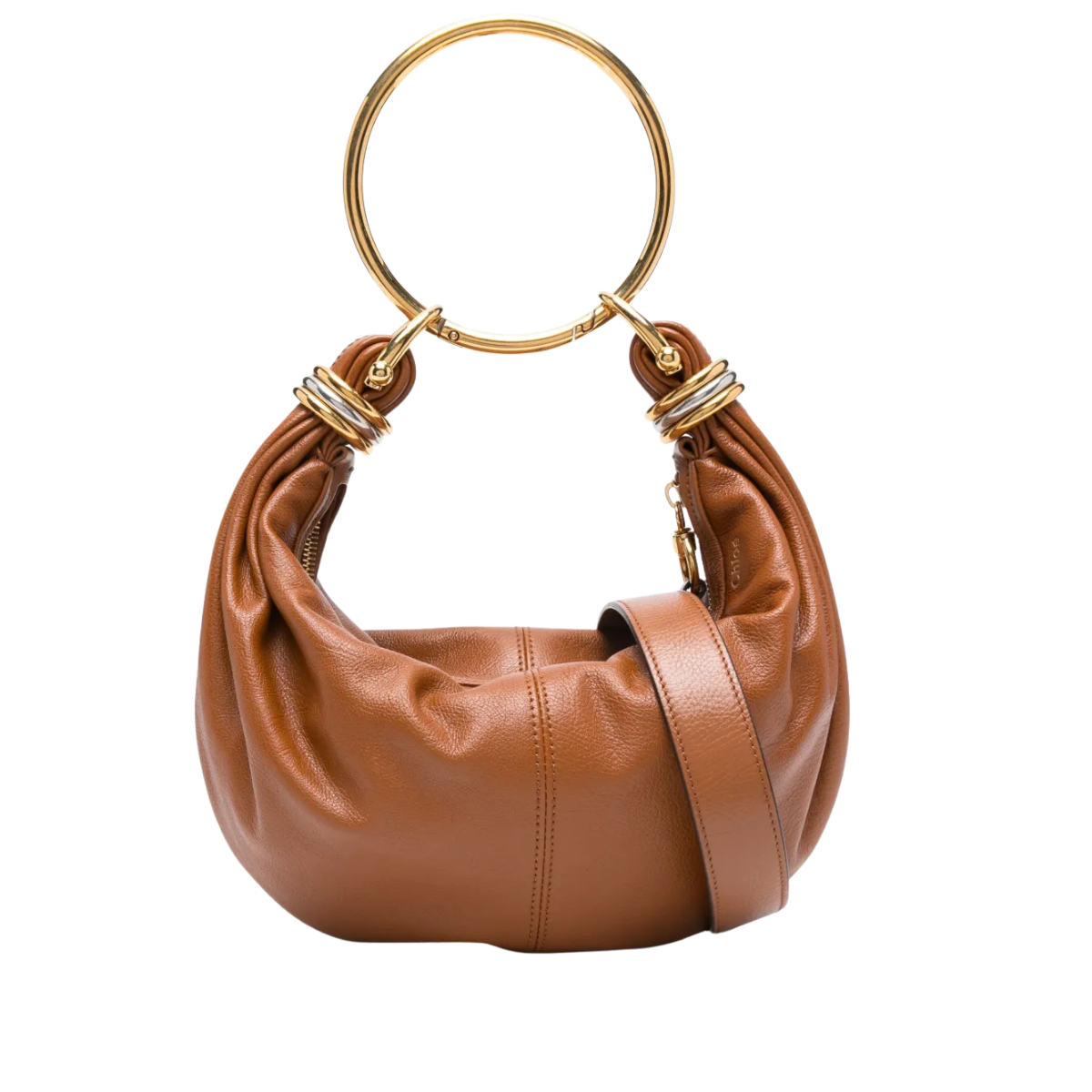 Meticulously crafted from the finest materials, the small Bracelet Hobo bag showcases the pinnacle of artisanal skill. The selection of grained calfskin leather, coupled with a light and transparent aniline finish, provides both durability and a luxurious tactile experience. The meticulous integration of the gold-finished metal handle, along with the stacked two-toned rings, speaks volumes of the dedication to impeccable design and quality.