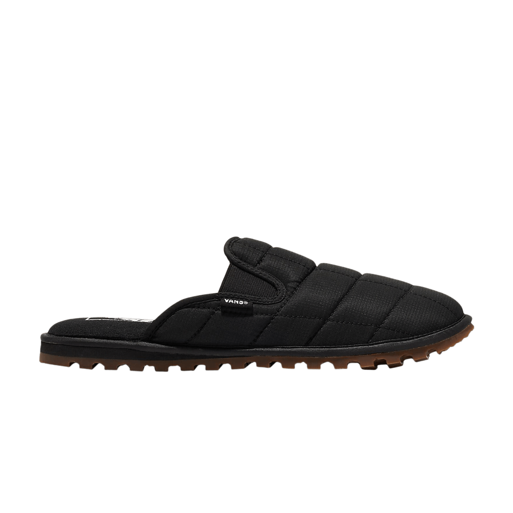 The Mountain Mule MTE 'Black' is meticulously crafted for both durability and comfort. It features a mule silhouette with a quilted design and slip-on construction, ensuring ease of wear. The upper is constructed from premium textiles and water-resistant materials, complemented by a soft cotton lining and, in some variants, a mild sherpa lining for added warmth. The design includes the Vans flag on the side and a white Vans hit on the heel, solidifying its identity.